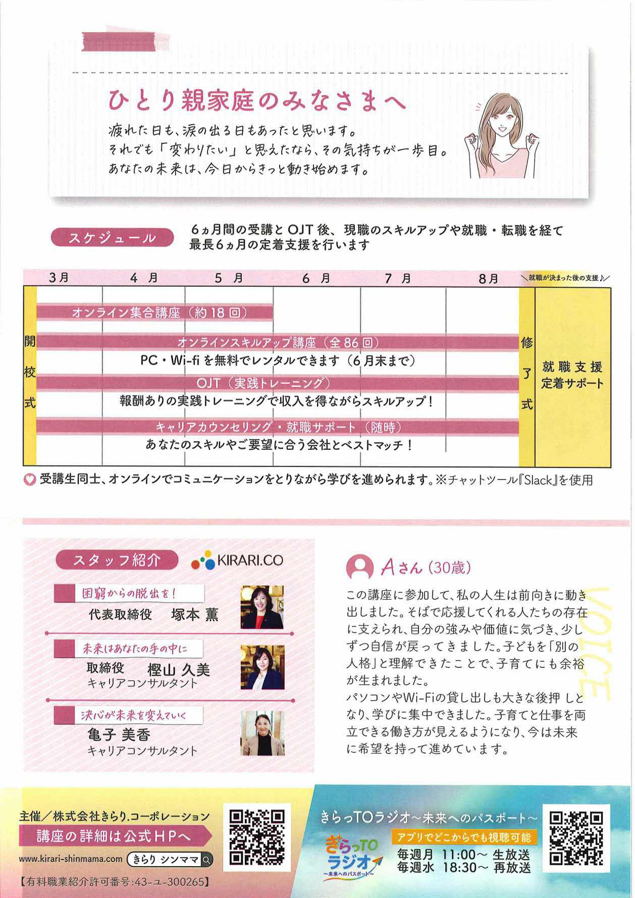 株式会社きらり.コーポレーションが開催するシングルマザーを対象とした「シンママアップデート就労支援講座」は、在宅でのオンラインによるパソコン学習と、現場での実務トレーニングを組み合わせたもので、デジタルスキルを習得し、自分をアップデートすることで就職や転職、スキルアップにつながる講座です。